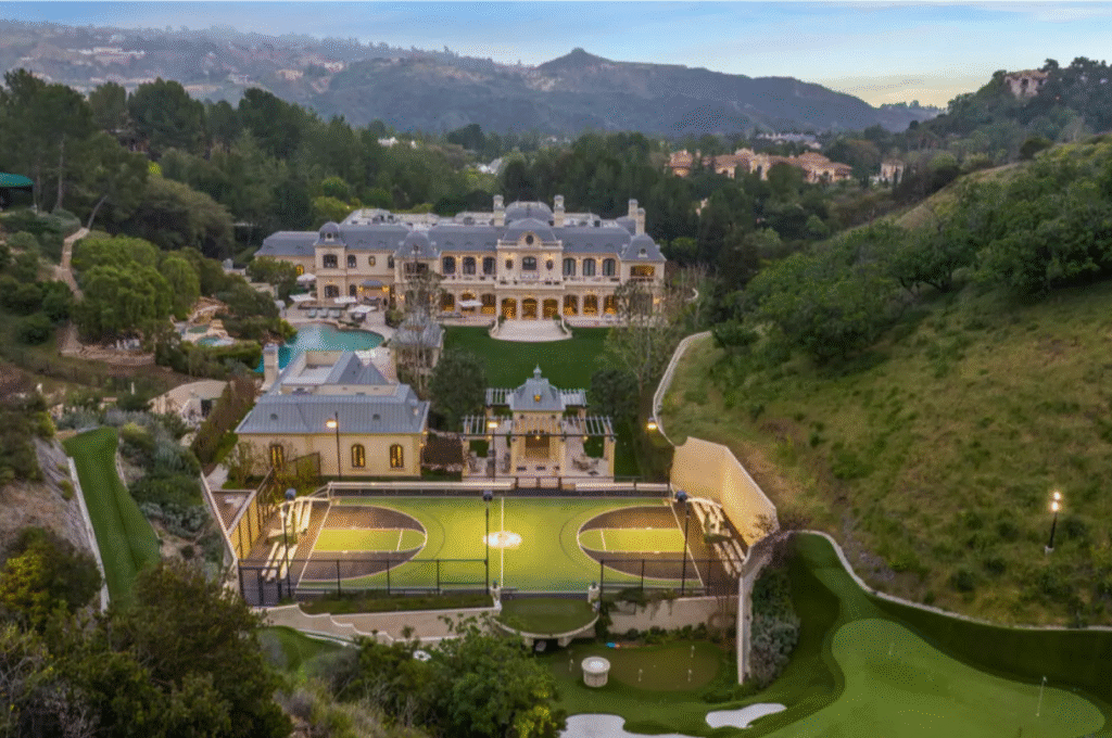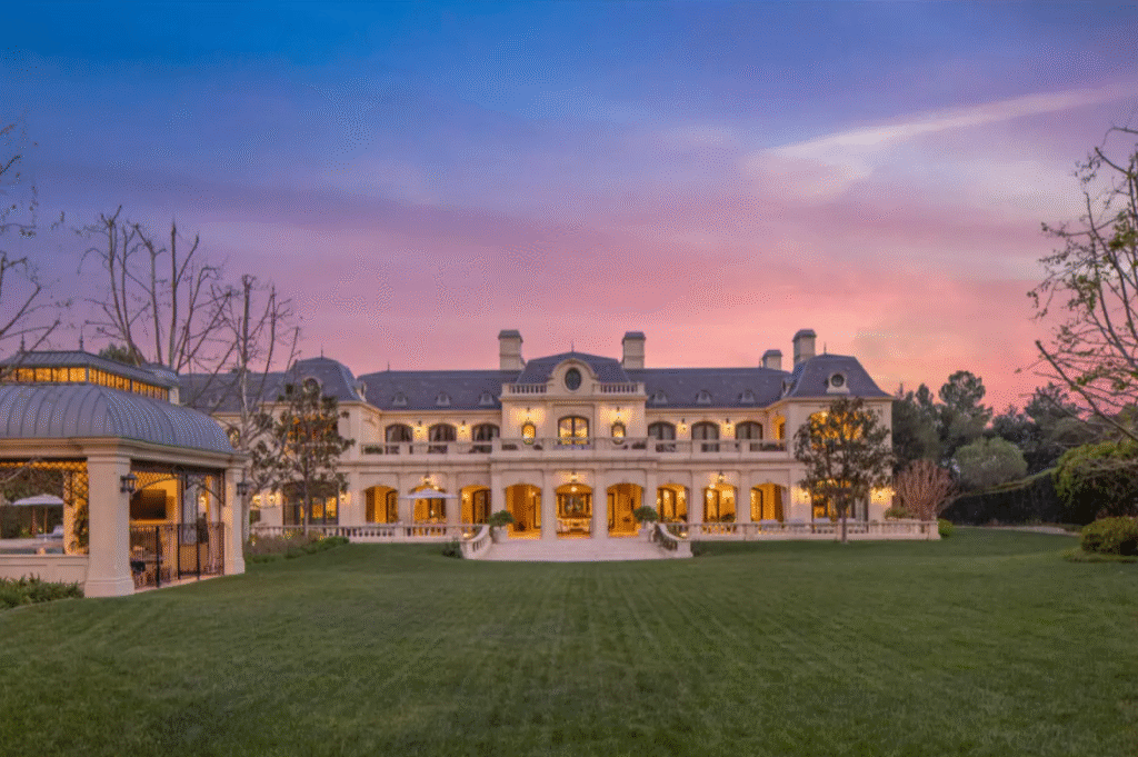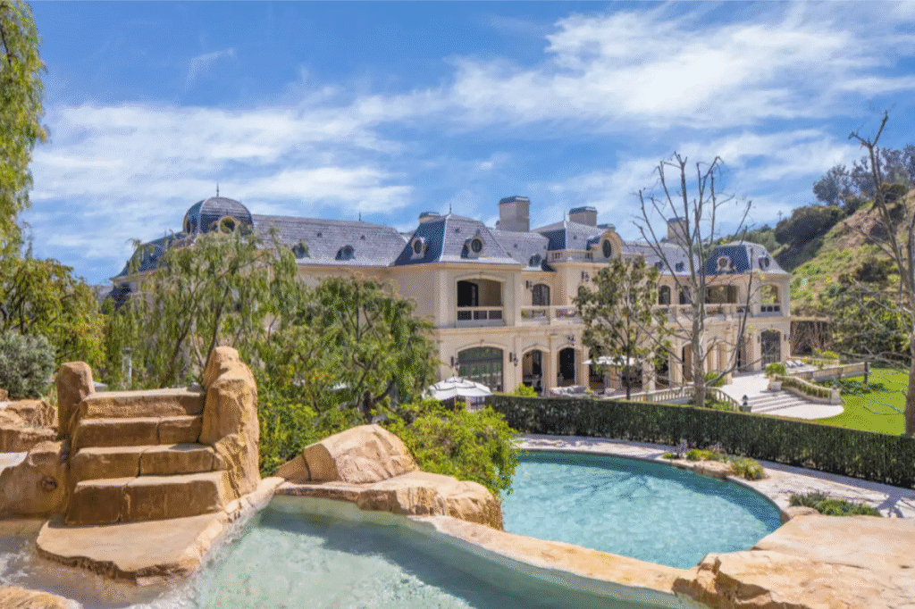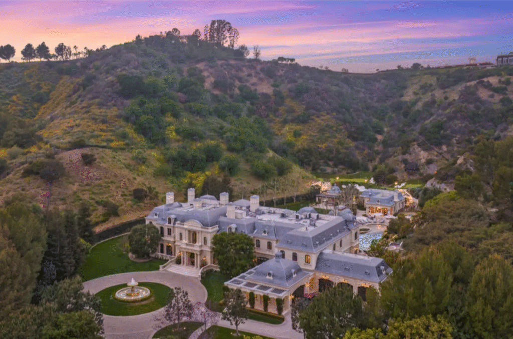 The mansion is reminiscent of a European chateau with its stone exteriors, tall windows, and elegant balconies. The property includes a large pool, manicured gardens, and plenty of greenery. At night, the house glows against the backdrop of the hills and Los Angeles sunsets. From aerial views, the estate looks like a palace hidden in the hills.
