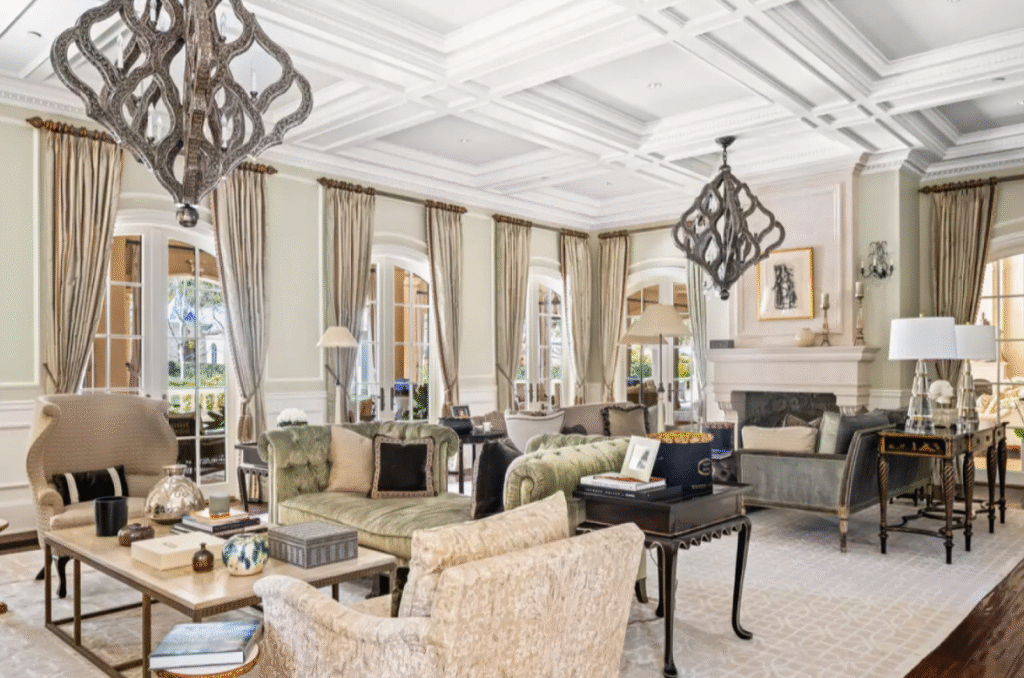 The living room is a mixture of modern and classic details. It features high ceilings, detailed moldings, large draped windows, and multiple seating areas. The room is made even more grand with neutral colors, luxurious couches, and eye-catching crystal chandeliers. The home is filled with attention to detail and meticulous craftsmanship. This makes sense considering the home was designed to be both a family residence and an entertainment space for guests.